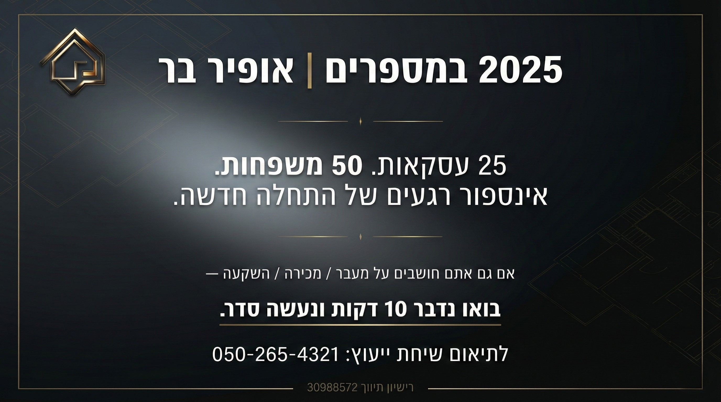 אופיר בר | יועץ נדל״ן בפתח תקווה שמביא תוצאות מוכרים נכס ורוצים למקסם מחיר, או קונים את הבית הבא שלכם? אני מלווה אתכם בביטחון מהערכת שווי ותמחור מדויק ועד חתימת החוזה. שיווק חכם • מו״מ מקצועי • ליווי אישי